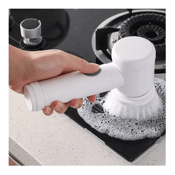 Presionas un botón y el cepillo GIRA SOLO a 300 RPM, arrancando la mugre que no sale a mano.